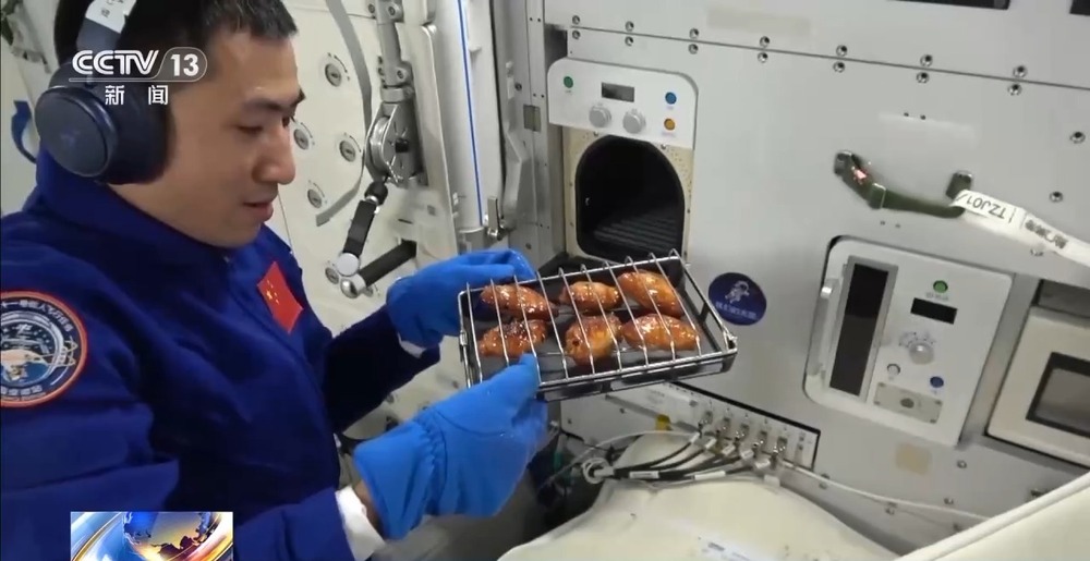神舟二十一号乘组和神舟二十号乘组在轨成功会师,为了庆祝我国空间站第七次太空会师,六名航天员运用刚刚被带上太空的新装备——热风烘烤机,在空间站做了一顿烧烤大餐。